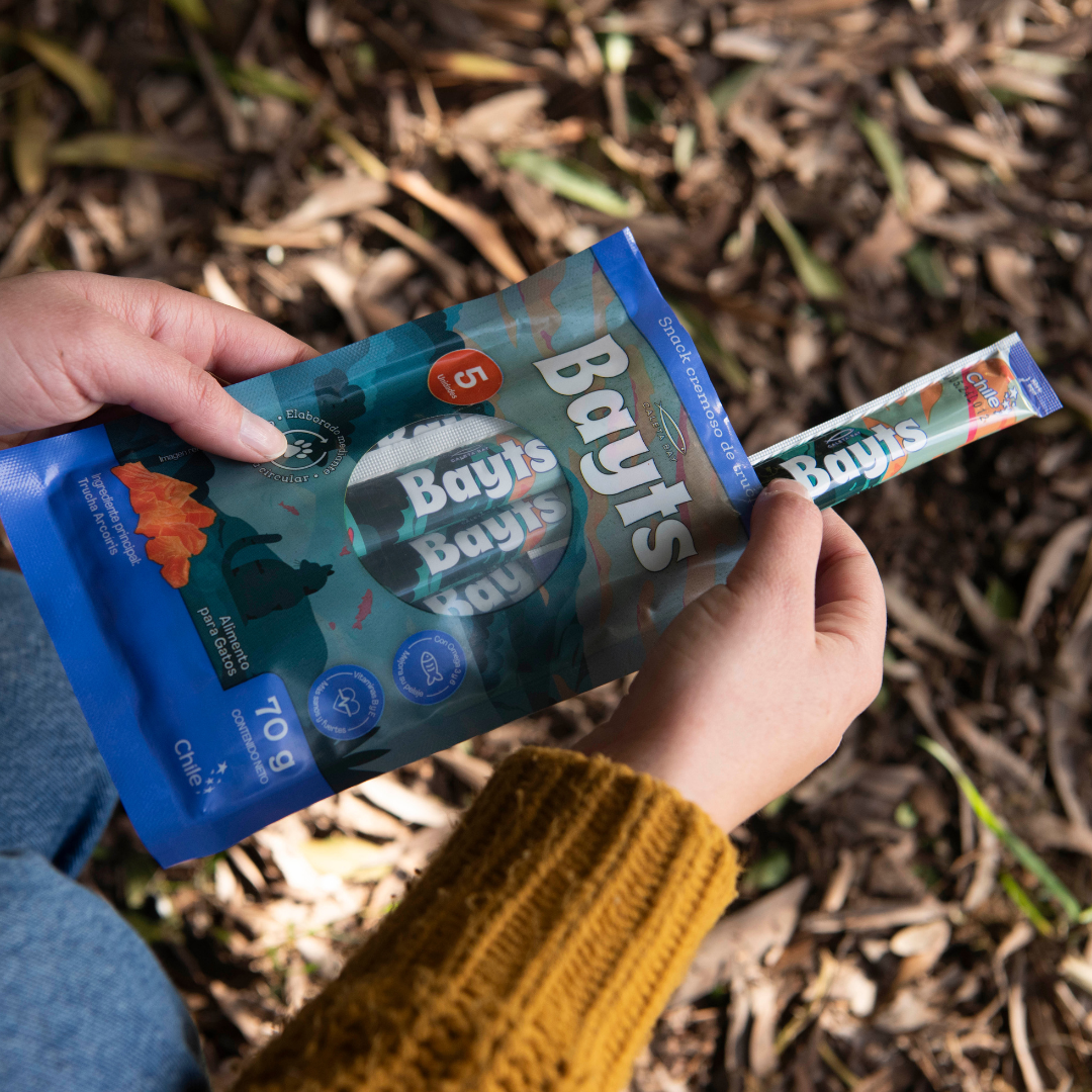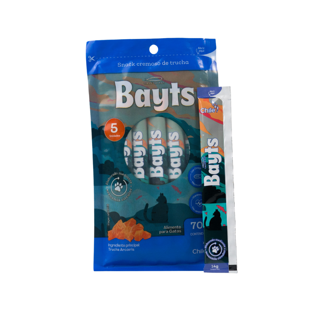 ¡Regalonea a tu felino con una explosión de sabor y nutrición directamente del Sur de Chile! El Snack Cremoso BAYTS® de Trucha Arcoíris es el treat húmedo perfecto para consentir a tu gato, ofreciéndole una experiencia deliciosa y saludable.